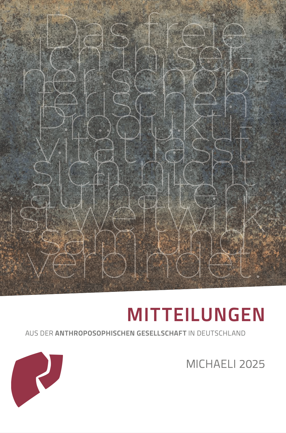 In den Mitteilungen berichten wir ausführlich über aktuelle Vorgängen aus der anthroposophischen Gesellschaft, den Arbeitszentren und weisen auf Veranstaltungen hin. Sie werden fünfmal im Jahr an Mitglieder verschickt und sind hier verfügbar.