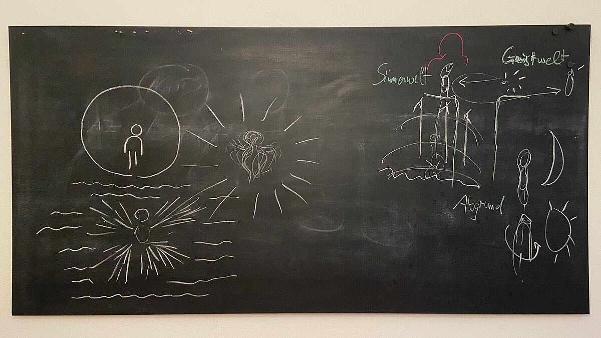 Tafelzeichnungen aus der Arbeit mit der 8.Klassenstunde | Foto: S.Knust Seit einigen Jahren kommen wir in Stuttgart etwa zweimal jährlich zu einem 24-stündigen Treffen von Freitag- auf Samstagabend zusammen. Bei dieser Veranstaltung versuchen wir, uns auf schöpferische Weise den Inhalten der von Rudolf Steiner gegebenen „Klassenstunden“ der „Freien Hochschule für Geisteswissenschaft“ zu nähern. Dabei arbeiten wir in chronologischer Folge und sind aktuell bei der achten Klassenstunde angelangt. In der Reihe der Klassenstunden wird ein innerer Weg beschrieben vom Herantreten an die Schwelle, dem Kennenlernen der „Tiere“ des Denkens, Fühlens und Wollens und deren Umwandlungen, dem Einleben in die Welt der Elemente und dem Kennenlernen des Verstrickt-Seins in diese Welt bis zum Schwellenübertritt und der meditativen Betrachtung der drei Seelenkräfte von jenseits des sogenannten „Abgrunds“ zwischen sinnlicher und übersinnlicher Welt.