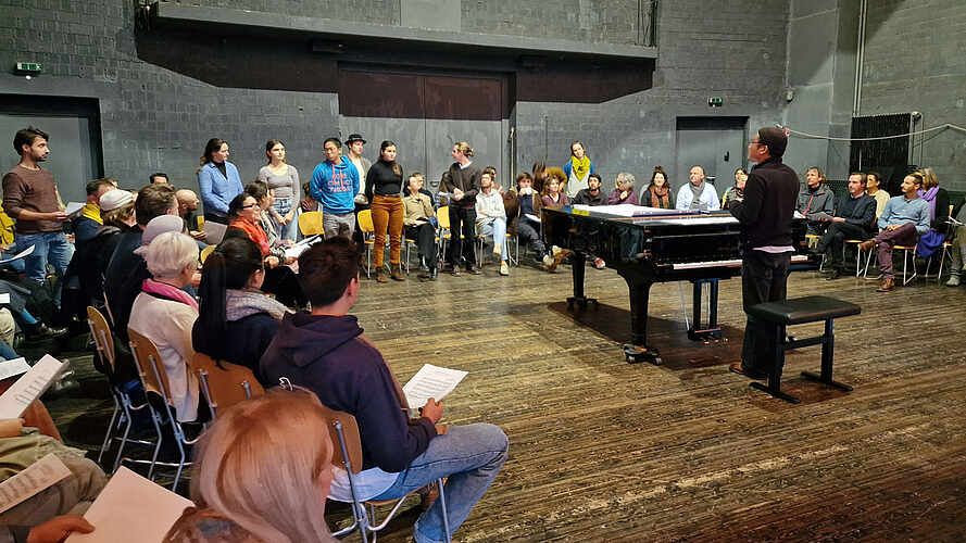 Der Tag startete mit einem sozialkünstlerischen Prozess. Alle Teilnehmenden kamen auf die Bühne des Saales in Mannheim und bewegten sich im Raum. Das ging über in einige Eurythmie-Übungen im Stehen. Im Weiteren versammelten sich alle um den Klavierflügel und summten eine Melodie, die sich dann zu einem Choral verdichtete. Dann stiegen die Teilnehmenden in „ihr“ Thema ein. Die Kleingruppen verteilten sich im Raum und auf dem Gelände der Hochschule, setzen sich nach dem Mittagessen fort, um dann in einem Plenum wieder zusammengeschaut zu werden. Insgesamt ein ermutigend-engagierter Vorgang, der alle angeregt hat, sich intensiv zu beteiligen. Insbesondere die Studentinnen und Studenten prägten das Klima der Zusammenarbeit. Sie kamen zum Beispiel aus Alfter (Alanus-Hochschule), aus Witten-Annen (Institut für Waldorfpädagogik), Mannheim (Erzieher-Fachschule und Waldorfpädagogik-Studium), Stuttgart (Eurythmeum).