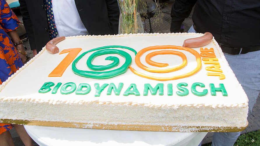 Geburtstagstorte zum Jubiläum | Foto: Demeter.de 38 Länder auf allen bewohnten Kontinenten, 3.200 Betriebe und rund 100.000 Hektar Fläche, das sind beeindruckende Zahlen für eine Bewegung, die nun 100 Jahre alt geworden ist: Biologisch-dynamisch, entstanden auf der Grundlage der Anthroposophie, ist Demeter das erste und gleichzeitig immer noch hochwertigste Bio-Label der Welt. Ein Grund, zu gratulieren, zu feiern – und in die Zukunft zu blicken. Bei Demeter gibt es eine Zusammenfassung der Feierlichkeiten in Brodowin: