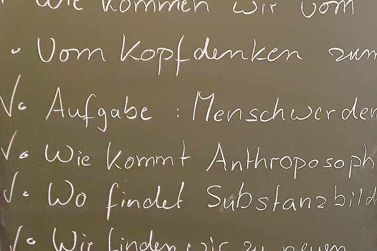 Ausschnitt Tafelanschrieb Ist Zweig- und Gruppenleben in der Anthroposophischen Gesellschaft überhaupt ein Thema, für das es Gesprächsbedarf und gegenseitiges Interesse gibt, haben wir als Vorbereiter uns manches Mal gefragt. Eine große Freude war es, dass sich fast 60 Personen für die Veranstaltungen angemeldet hatten, trotz der besonderen Umstände in diesen Zeiten.