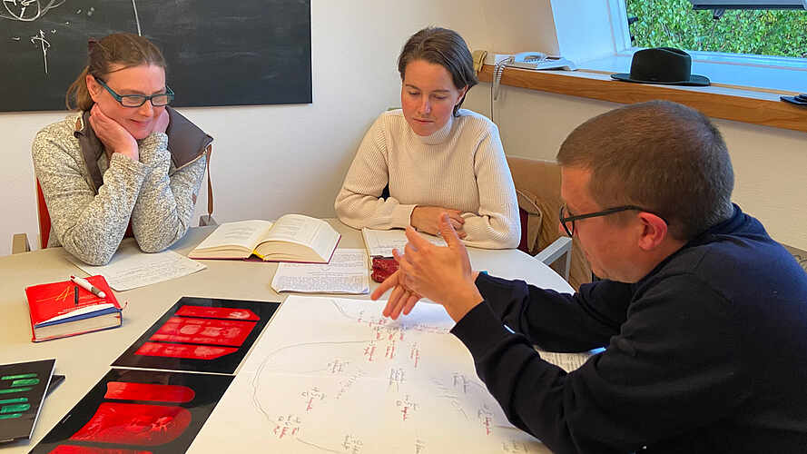 Gespräch zu den "Roten Fenstern" des 1. und 2. Goetheanums | Foto: S.Knust Junge Hochschule – diesen Arbeitstitel haben wir uns nicht gegeben, weil wir besonders jung wären – zwischen 30 und 40 Jahre – sondern eher, weil wir versuchen, einen frischen Blick zu bewahren und einen möglichst unseren Bedürfnissen gemäßen Arbeitsansatz zu praktizieren. Rudolf Steiner hielt gegen Ende seines Lebens 19 sogenannte „Klassenstunden“, die im Wesentlichen aus meditativen Versen (Mantren) und ergänzenden Erläuterungen bestehen und die bis heute ein wichtiger Gegenstand der Auseinandersetzung und Inspiration für viele Gruppierungen in der anthroposophischen Bewegung darstellen. Neben dem gemeinsamen Lesen der Mantren ging es uns auch um ein anknüpfendes Gespräch sowie um künstlerische und meditative Vertiefung einzelner Passagen oder Worte aus den Mantren. Die Arbeit wird von der Anthroposophischen Gesellschaft in Deutschland unterstützt. In den folgenden kurzen Beiträgen geben Mitglieder der Gruppe in kurzen „Blitzlichtern“ wesentliche Erlebnisse oder Lerneffekte wieder.