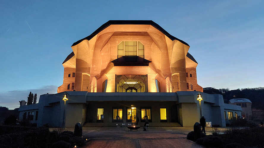 Goetheanum beleuchtet in der Silvesternacht 2022/23 | Foto: M.Elbert Weit über 1.000 Menschen versammelten sich in der Silvesternacht auf dem Hügel in Dornach, um im Gedenken an den Brand des ersten Goetheanum vor 100 Jahren den Blick auch in die Zukunft zu richten. João Torunsky, Erzoberlenker der Christengemeinschaft, leitete in der Dämmerung den Silvesterabend ein mit einem Beitrag zu „Feuerflammen – Opfer zwischen Zerstörung und Liebe“. Bereits am Silvestermorgen hatte der Arzt und Buchautor Peter Selg ausführlich im Gedenken an die Brandnacht über die zum Brand führenden Umstände und über das Geschehen an Silvester 1922 gesprochen. Viele damals Beteiligte berichteten über die kaum fassbare Kraft, die von Rudolf Steiner ausging, als er nach der schmerzdurchlittenen Brandnacht im aufgehenden Morgen entschieden feststellte: Wir setzen unsere Arbeit fort! Wir bauen das Goetheanum wieder auf. Es sollen die Vorbereitungen für das Dreikönigsspiel am Nachmittag in der völlig verrußt-durchnässten Schreinerei neben der noch qualmenden Brandstelle aufgenommen werden – falls die Kostüme nicht zerstört seien, fände die Aufführung wie geplant statt, an dem Abendvortrag solle ebenfalls festgehalten werden. „Der große Schmerz versteht zu schweigen über dasjenige, was er fühlt.“ So beginnt Rudolf Steiner an diesem Abend dann.
