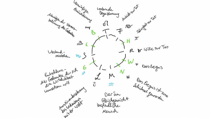 Der Samstag beginnt nach einem Frühstück wiederum draußen mit der eurythmischen Einstimmung in die Tierkreiszeichen von Zoe, mit den Konsonanten zu den Bildern. Wir üben das T und sein gegenüberliegendes M immer so, dass wir den Halbkreis zu der anderen Position laufen. Hinzu kommen R und S als Kreuz sowie F und L. Mehrmals laufen wir als Gruppe, jeder in seinem T beginnend, durch diese Positionen. Am Nachmittag folgen die anderen Positionen.