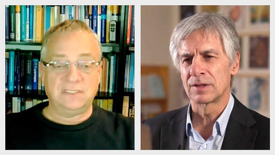 Harald Matthes (Gemeinschaftskrankenhaus Havelhöhe) und Gerald Häfner (Goetheanum) | Bild: Goetheanum.TV In Leitmedien und weiten Teilen der Politik wird die vierte Corona-Welle als „Pandemie der Ungeimpften“ beschrieben. Die Ungeimpften seien also Schuld an der Überlastung der Krankenhäuser und an den hohen Inzidenzen in Deutschland. Matthes hält diesen Behauptungen den eklatanten Rückgang der Intensivbetten im Vergleich zur dritten Welle Anfang des Jahres 2021 entgegen, beruhend auf der hohen Abwanderung von Pflegepersonal. Außerdem sieht er die Problemlage der vierten Welle vor allem bei der Politik, die eine angemessene Booster-Kampagne von Geimpften im Sommer schlicht versäumt hat: