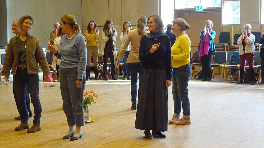 Ita-Wegman-Kongress: Applaus für die Vorbereiterinnnen | Foto: B.Messmer Vom 21. bis 23. Oktober 2022 hat der Kongress „Ita Wegman - freier - weiblicher - fortschreiten“ der „Gesellschaft Anthroposophischer Ärztinnen und Ärzte“ in der Freien Waldorfschule Kassel stattgefunden. Etwa 150 Frauen aus Heilberufen – Ärztinnen, Krankenschwestern, Therapeutinnen, Hebammen, Apothekerinnen – aus Deutschland, Österreich und der Schweiz sowie drei Ärzte nahmen teil. Nur zu Frauenthemen oder von Frauen gab es Workshops, Vorträge, Plena und Begleitveranstaltungen (Singen, Bewegen nach „Spacial dynamics“, Meditation). Als Besonderheiten: gemeinsames Frühstück, das Weben aller an einem Teppich, spätabends Musik und Tanz oder „Open Space-Bühne“.