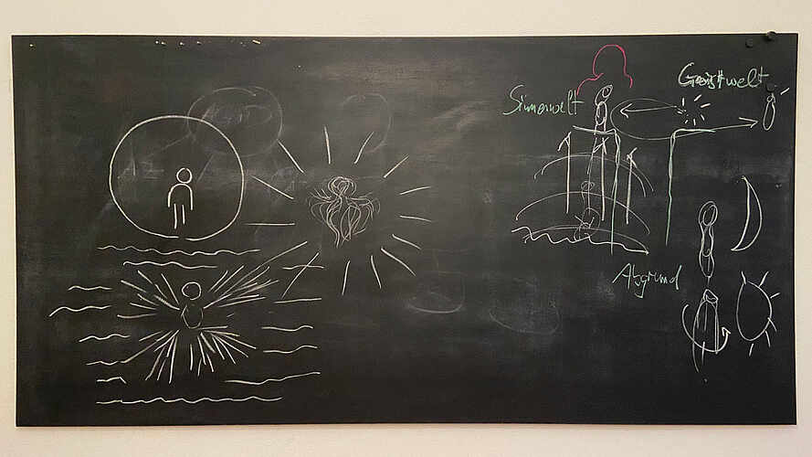 Tafelzeichnungen aus der Arbeit mit der 8.Klassenstunde | Foto: S.Knust Seit einigen Jahren kommen wir in Stuttgart etwa zweimal jährlich zu einem 24-stündigen Treffen von Freitag- auf Samstagabend zusammen. Bei dieser Veranstaltung versuchen wir, uns auf schöpferische Weise den Inhalten der von Rudolf Steiner gegebenen „Klassenstunden“ der „Freien Hochschule für Geisteswissenschaft“ zu nähern. Dabei arbeiten wir in chronologischer Folge und sind aktuell bei der achten Klassenstunde angelangt. In der Reihe der Klassenstunden wird ein innerer Weg beschrieben vom Herantreten an die Schwelle, dem Kennenlernen der „Tiere“ des Denkens, Fühlens und Wollens und deren Umwandlungen, dem Einleben in die Welt der Elemente und dem Kennenlernen des Verstrickt-Seins in diese Welt bis zum Schwellenübertritt und der meditativen Betrachtung der drei Seelenkräfte von jenseits des sogenannten „Abgrunds“ zwischen sinnlicher und übersinnlicher Welt.