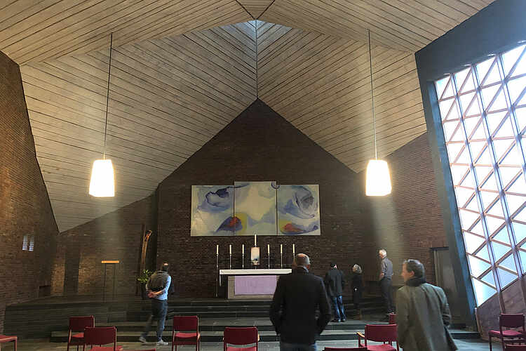 Besuch der Christengemeinschafts-Kirche von Sharoun Vom 11. bis zum 12. November tagte der Vorstand der Anthroposophischen Gesellschaft in Deutschland (AGiD) in Bochum. Die Kirche der Christengemeinschaft stand uns auf Einladung von Tom Tritschel zur Verfügung, der hier sein Priesteramt ausübt. Die Scharoun-Formen des Altarraums sind bewegt. Das Licht strahlt von der Decke und einer Glaswand. Die roten Ziegelwände sind gebogen und changieren lebendig. Selbst der Boden ist leicht geneigt – zum Altar hin. Der Kirchenraum wird vom Eingang aus nicht gradlinig betreten, sondern mit einer 180 Grad Kehrtwende – eine Bewusstseinsbildung im Zugang auf das Wesentliche. Irgendwie macht das alles Sinn und ist substanzbildend. Wir geben uns Mühe, die Sitzung entsprechend „würdig zu vollbringen“.