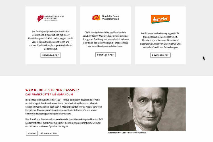 Ausschnitt aus der neuen Homepage Seit einige Monaten steht die Anthroposophie und die anthroposophische Bewegung in den Schlagzeilen, nicht wegen ihres Erfolges: Ihr und ihrem Begründer Rudolf Steiner wird unter anderem zum wiederholten Male Rassismus und Antisemitismus vorgeworfen. Zu Recht? Die zahlreichen Gegendarstellungen, Stellungnahmen und Antworten, die von anthroposophischer Seite veröffentlicht wurden, sind bisher – vor allem außerhalb der Bewegung und im Internet – noch nicht zur Kenntnis genommen worden.