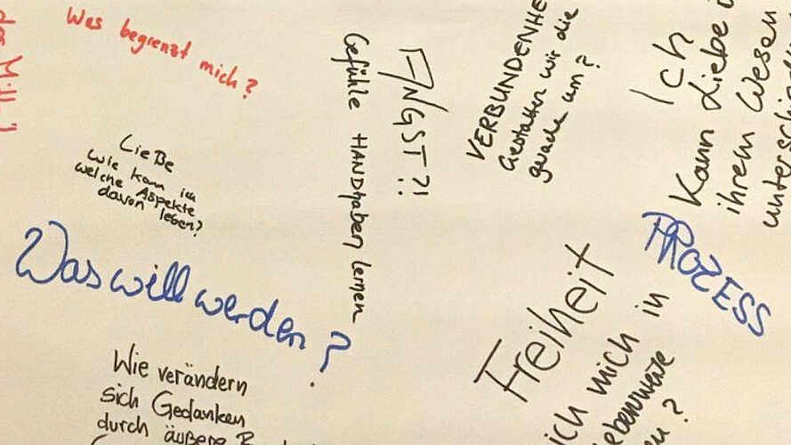 Später kuschle ich mich im Bettenlager in meinen warmen Schlafsack und schlafe schnell ein. Am nächsten Morgen sind die Frühaufsteher schon fleißig dabei, in der Küche Obst zu schnippeln, Porridge zu kochen und Brot zu schneiden. Vormittags beschäftigen wir uns mit Fragen, die uns persönlich gerade beschäftigen oder einen anderen Bezug zu uns haben. Erst einmal schreibt jeder mehrere Fragen auf. Ich finde es gar nicht so leicht, ein Thema, das mich beschäftigt, in einer konkreten Frage zu formulieren. Alle Fragen werden auf Zetteln gesammelt und mir fällt auf, dass ein Großteil auch in mir schon einmal aufgetaucht ist. Stellen wir uns vielleicht alle ähnliche Fragen? Jeweils zu zweit beschäftigen wir uns dann mit je zwei Fragen.