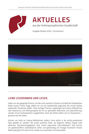 Sie sind an den Aktivitäten, Projekten und Veranstaltungen in der Anthroposophischen Gesellschaft in Deutschland interessiert? Mit unserem Newsletter AGiD.AKTUELL informieren wir Sie monatlich. Bei Interesse können Sie sich gerne im Formular unten in die Versandtliste eintragen. Im Archiv stehen außerdem die Druckversionen des Newsletters als PDF für Sie bereit.